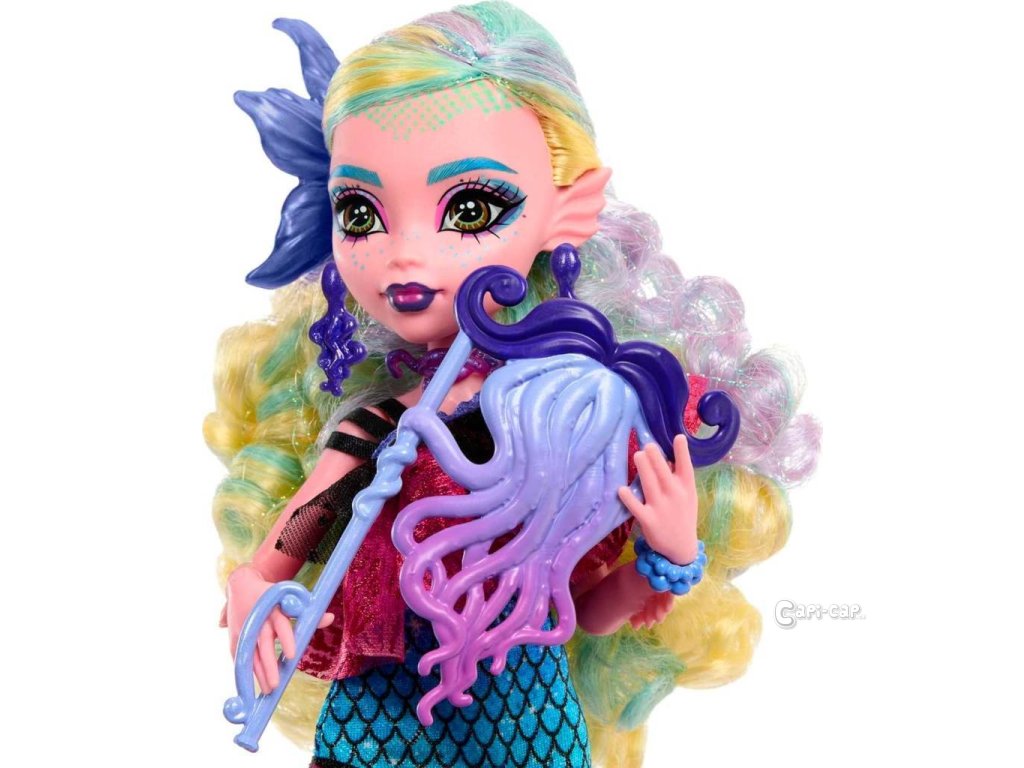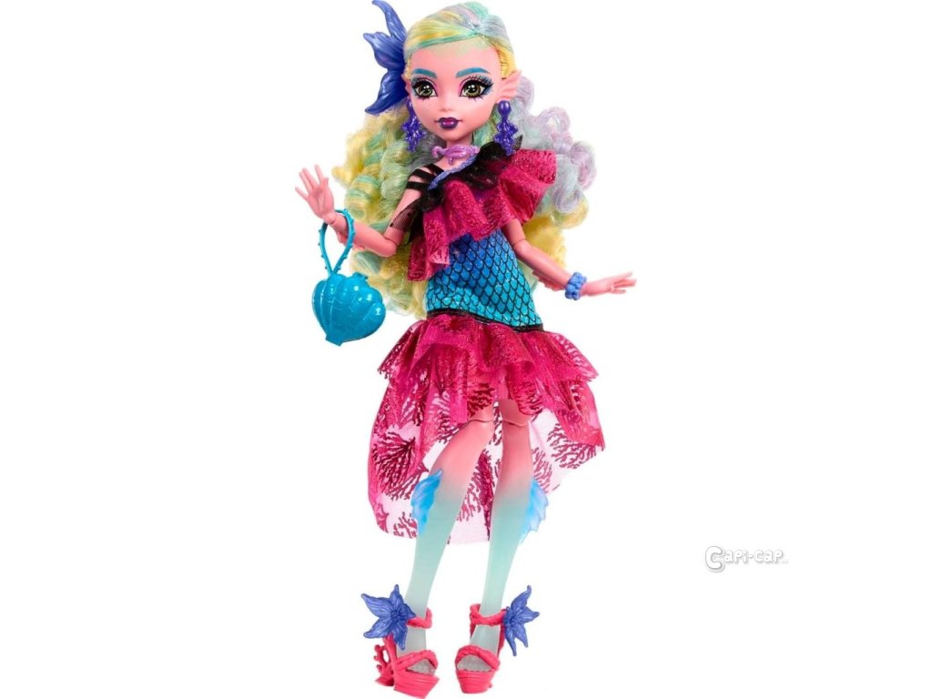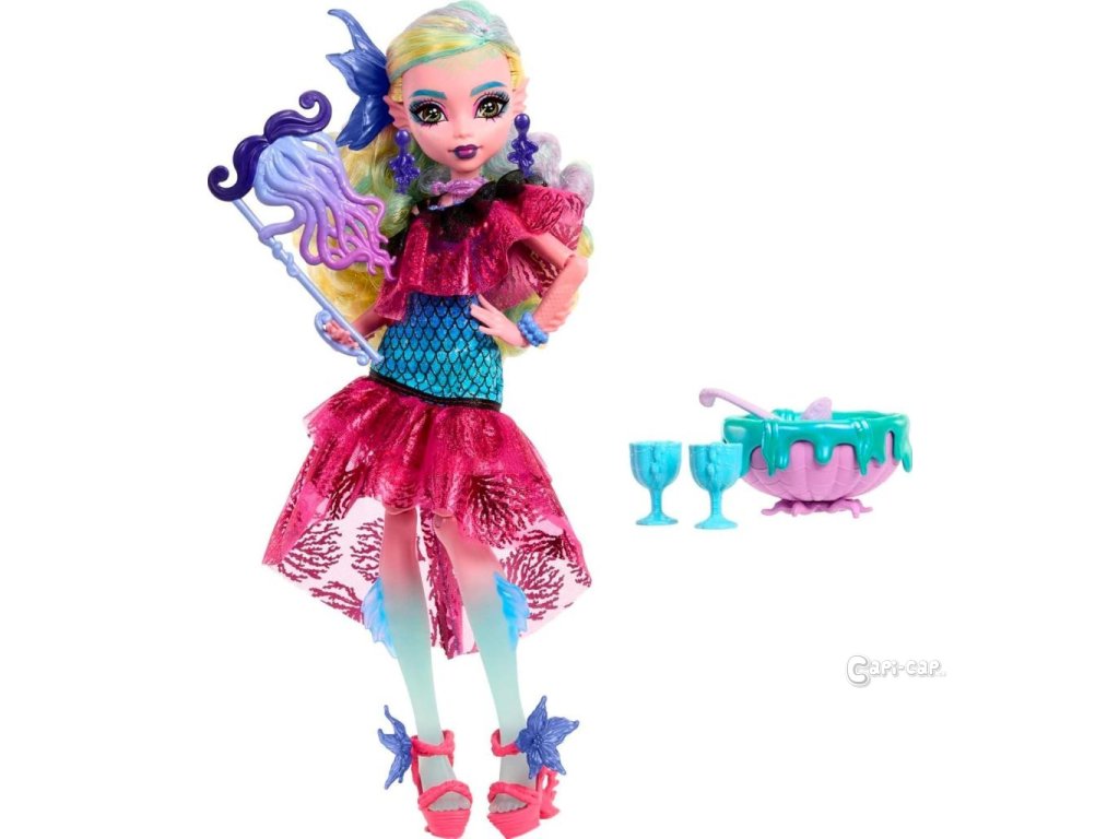 Panenka Lagoona Blue která jistě udělá parádu na strašidelném parketu Monster High. Šaty ve tvaru vějíře tohoto mořského monstra mají šupinatou podprsenku! Průhledné, zdobené korálovými detaily volánu u výstřihu a ve spodní části dodávají stylingu neuvěřitelně glamour. Její lesklé kadeře jsou posunuty na stranu pomocí báječné kytičky a náušnice ve tvaru chobotnice, náramek z korálků a sandály na platformě dotvářejí její kouzlo. Další doplňky pro vyprávění příběhů udělají večer strašidelným: skupinová selfie na památku noci, rekvizita pro fotografii medúzy a punč s přílivovou vlnou ve sklenicích na pití.