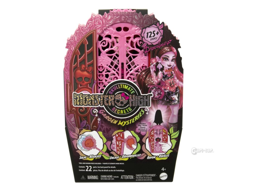 Vyřešte záhadu, odemkněte brány Monster High™ a odhalte panenku z kolekce Skulltimate Secrets: Záhadná zahrada! Děti si mohou hrát na strašidelné detektivy a hledat stopy na mapě pomocí „kouzelného“ klíče s lupou. Cestou objeví více než 19 překvapení a zažijí děsivě zábavný zážitek při rozbalování! Po skončení hraní mohou děti uložit monsterku, oblečky a doplňky do strašidelného šatníku, který je ideální jak pro hraní příběhů, tak pro uložení hraček! Každá panenka se prodává samostatně v závislosti dostupnosti. Panenky jsou plně kloubové a nemohou stát samostatně. Barvy a vzhled výrobku se mohou lišit.