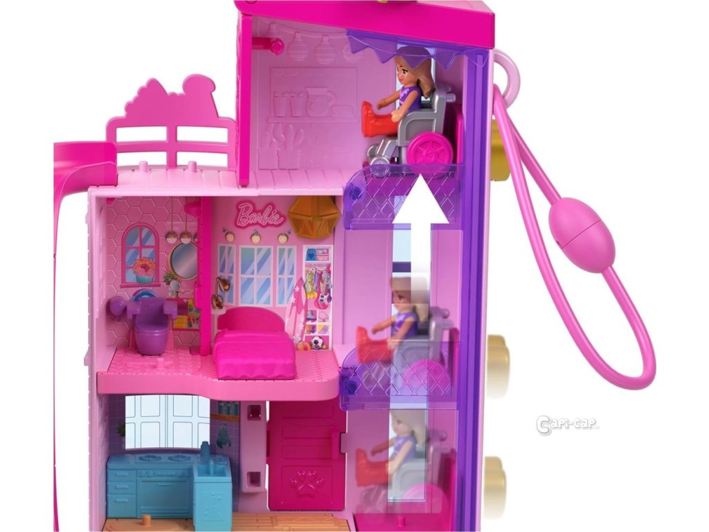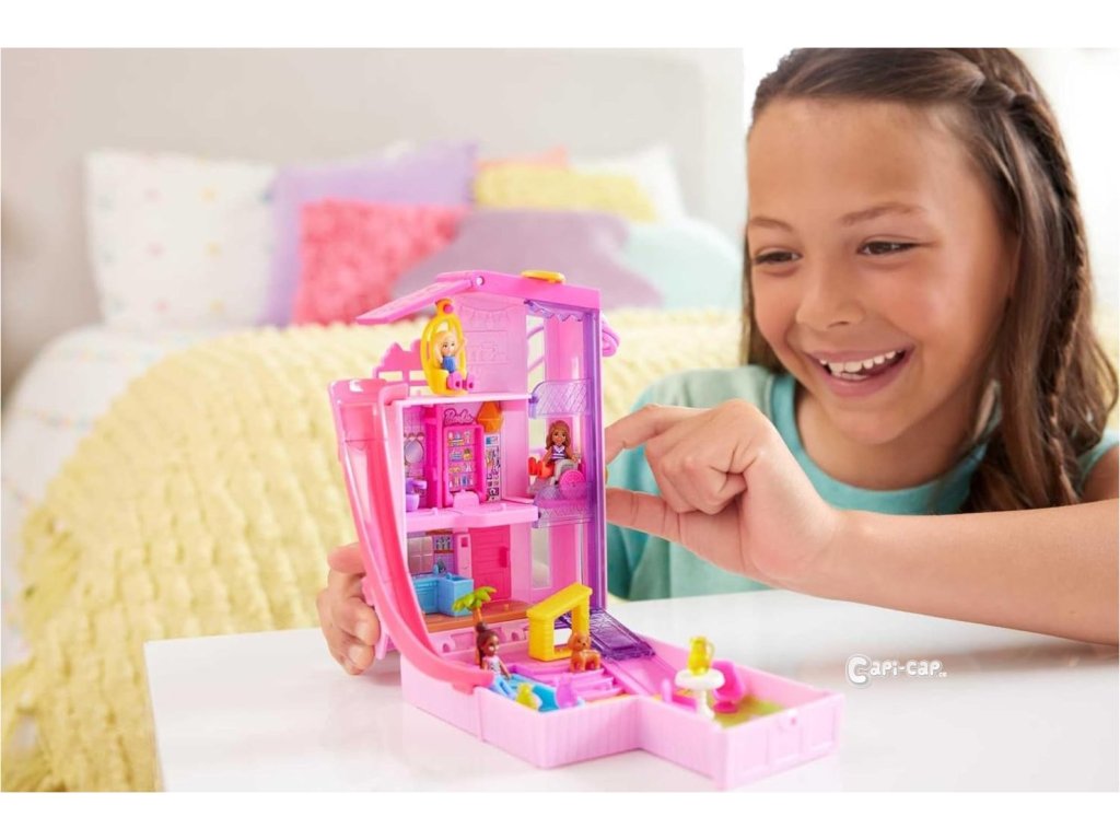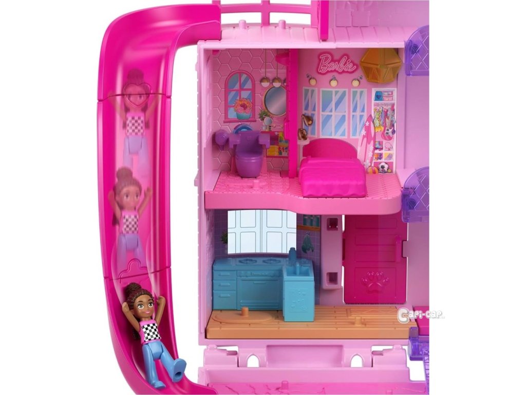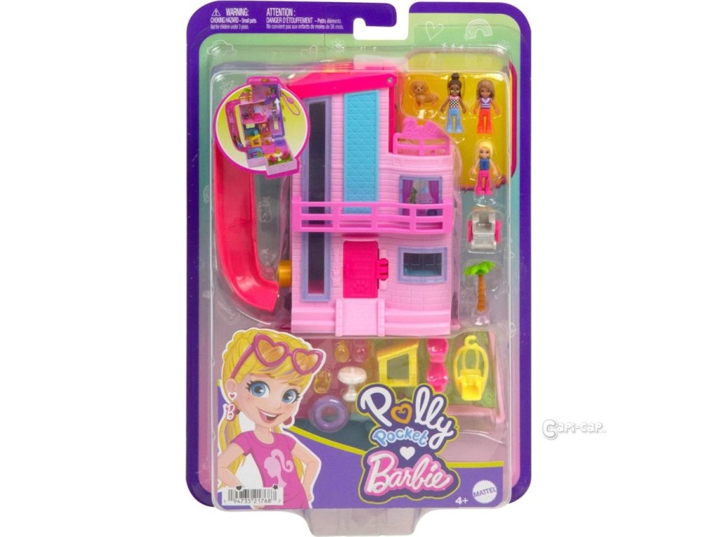 Polly Pocket™ a Barbie® se spojily v této dokonale růžové pocketce, která připomíná ikonický Barbie® Dům snů v mini podobě Polly Pocket™! Herní set domečku pro panenky je dodáván se třemi pidi panenkami, jedním štěňátkem a 11 doplňky, včetně invalidního vozíku. Uvnitř mini domečku snů mohou děti odklopit střechu a odhalit skluzavku, projet se výtahem pro vozíčkáře nebo si prohlédnout knihovnu, která se otevírá do postele. Barbie®, Brooklyn a kamarádka rády sjíždějí po skluzavce a cákají se v bazénu pro Barbie®.