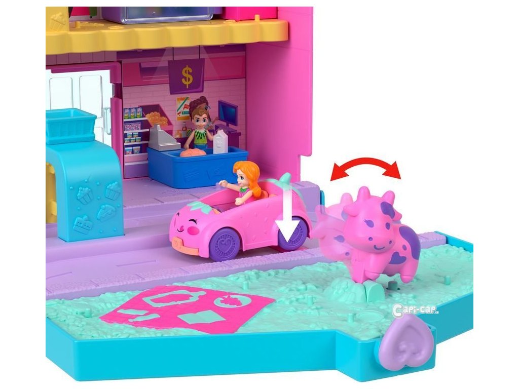Uvnitř obchodu mohou panenky vážit produkty na váze, vybírat si chutné věci, jako je chléb a zmrzlina, a naplnit mini nákupní košík. Nakonec zamiřte k pokladně v prvním patře a dokončete svůj vzrušující nákup. Nezapomeňte při výjezdu přejet přes rychlostní hretardér a aktivovat zábavnou jízdu na krávě!