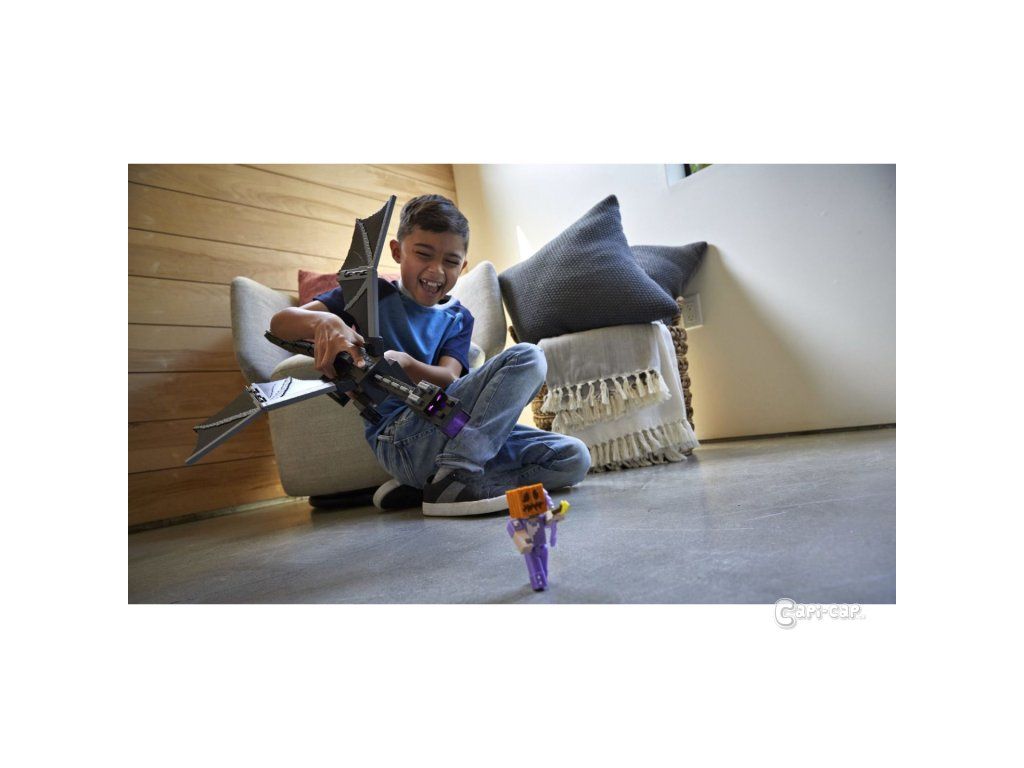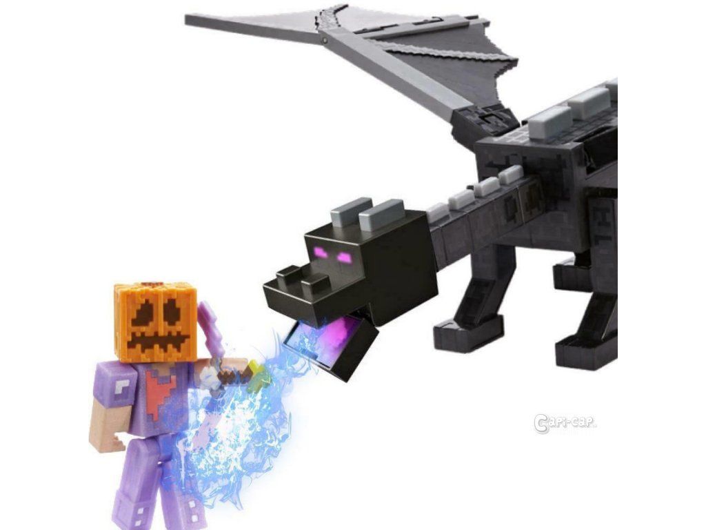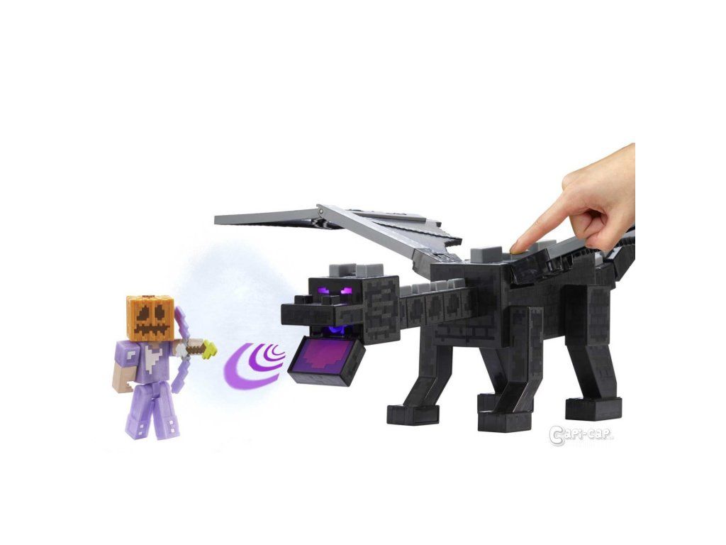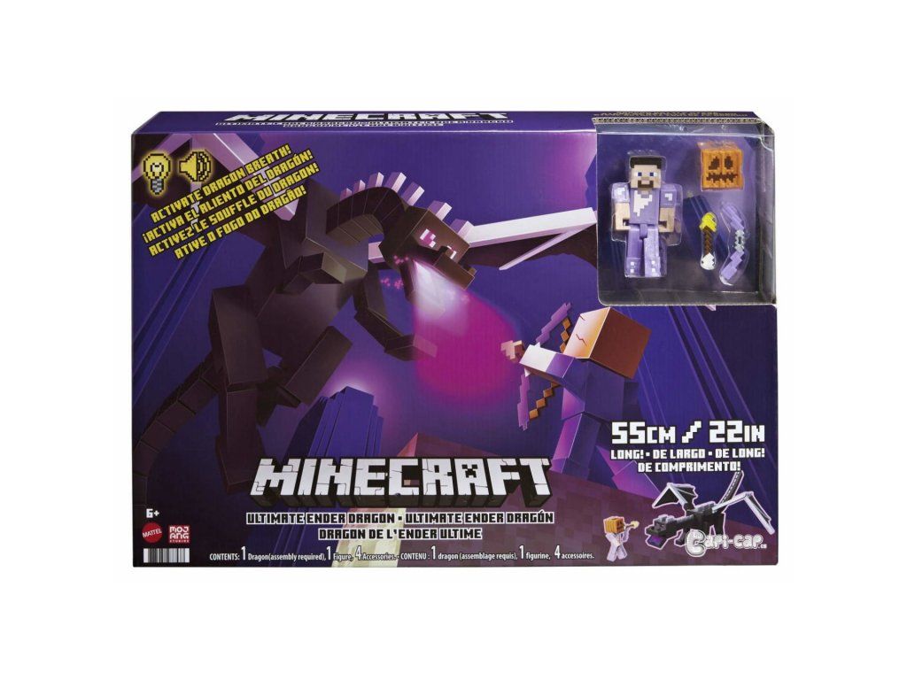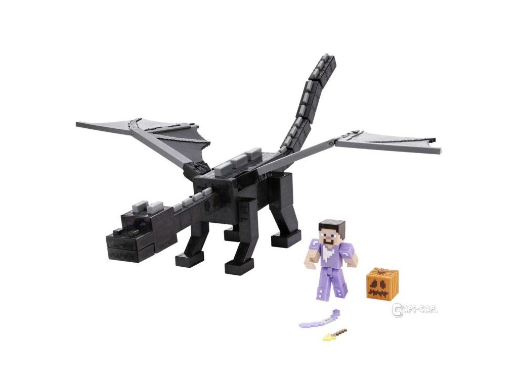 Enormní Drak Ender má rozpětí křídel 51 cm a vydává světlo a zuřivé zvuky! Hrací sada obsahuje figurku Steva o velikosti 8 cm, která změní barvu, když je zasažena mlžným dechem Draka Endera! Dodává se také s příslušenstvím, které nabízí Stevovi šanci bojovat proti divokému a mocnému drakovi: bojové brnění, zbraň a další bitevní příslušenství pro epické bitevní scény.