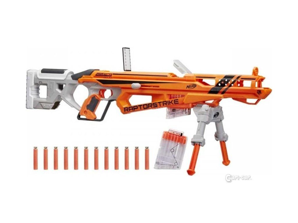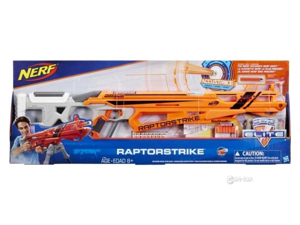 Blaster z řady Accustrike je největší ze své řady. Vyhraj souboj s novým blasterem RaptorStrike, který byl navržen pro co největší přesnost. Pro ještě větší přesnost a stabilizaci tento blaster má vepředu dvojnožku. Tak nabij a střílej. V balení je 18 Accustrike nábojů.