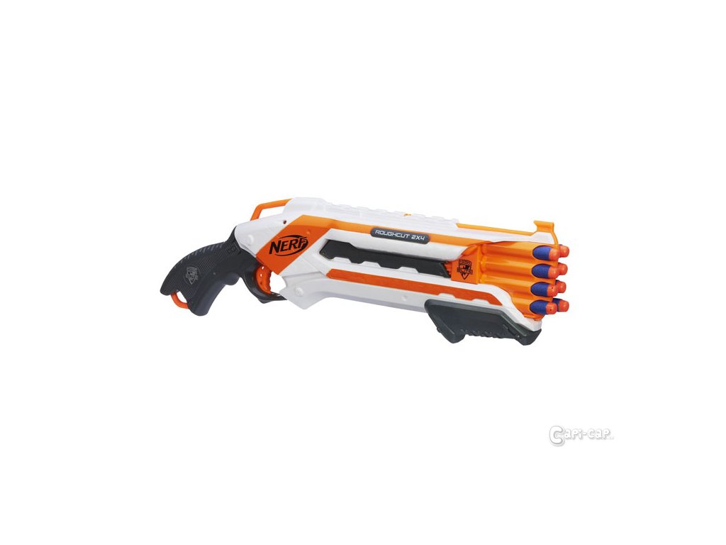Naskočte do boje s převahou dvouhlavňové pistole Rough Cut 2X4! Tato elegantní pistole vám umožní vystřelit 2 šipky Elite Darts na terče najednou až na vzdálenost 75 stop a opakovací konstrukce vám umožní opakovaně nabíjet a vypouštět stálý dvojitý proud šipek! Vystřelte až 8 šipek Elite Darts bez dobíjení! Tactical Rail umožňuje připojit většinu doplňků N-Strike Tactical Rail (prodávají se samostatně) pro vyšší bojovou efektivitu. Zdvojnásobte svou střelbu pomocí pistole Rough Cut 2x4 a připravte se na ovládnutí bojiště s oběma hlavněmi!