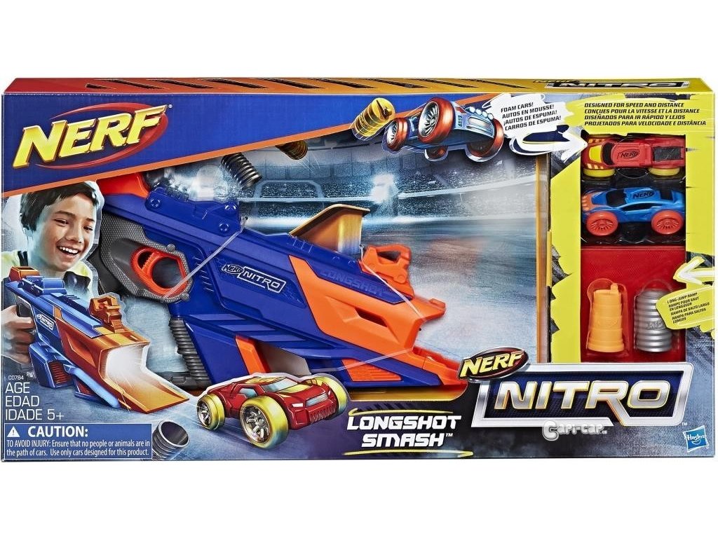 Užij si nevšední zábavu s Nerf Nitro blasterem Longshot Smash! Blaster je v balení dodáván se 4 překážkami, které si můžeš nastavit podle sebe a sestavit si tak super dráhu. Střílej pěnová autíčka na rampu a vytvářej tak nejšílenější kaskadérské akce! V balení je blaster, 4 překážky, rampa a 2 pěnová autíčka.