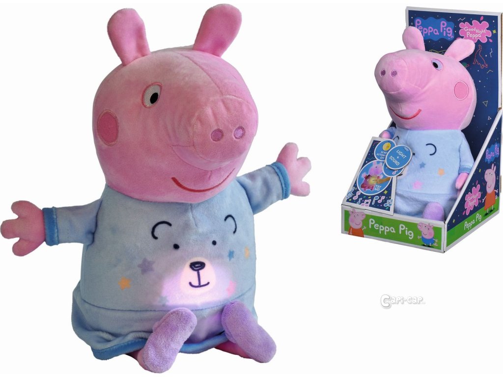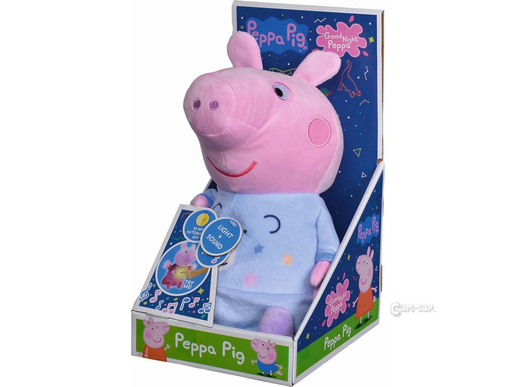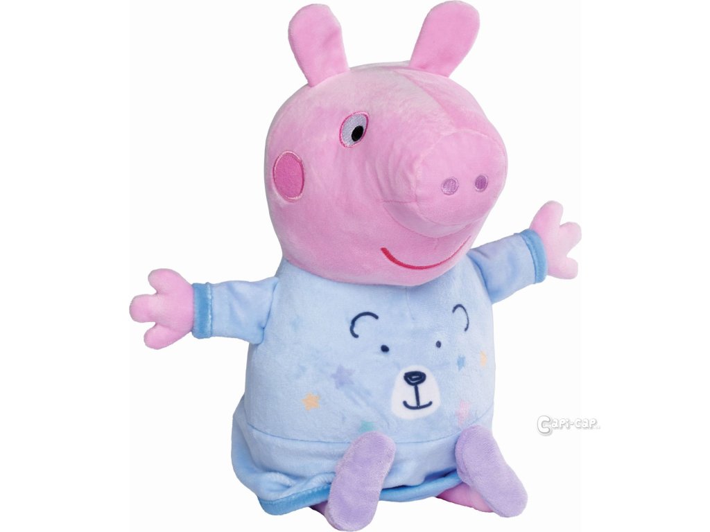 Oblíbené prasátko Peppa v roztomilém modrém pyžamku hraje ukolébavku a svítí příjemným nočním světýlkem. Automatické vypínání. Skladba má délku 15 minut, světlo svítí 30 minut.