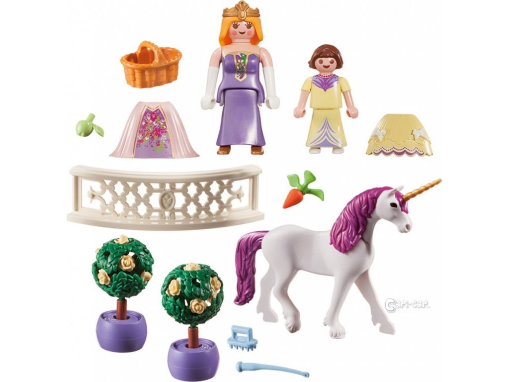 Kufřík obsahuje figurku princezny,holčičky, jednorožce, 2 okrasné stromky, zábradlí, sukně na převlékání a další příslušenství.