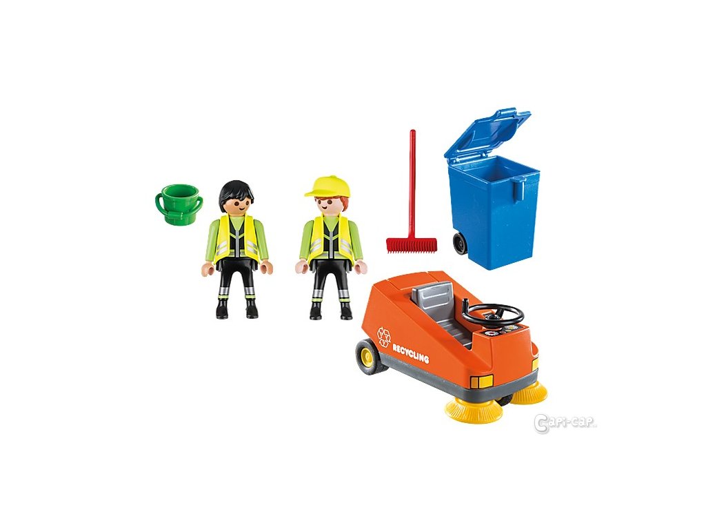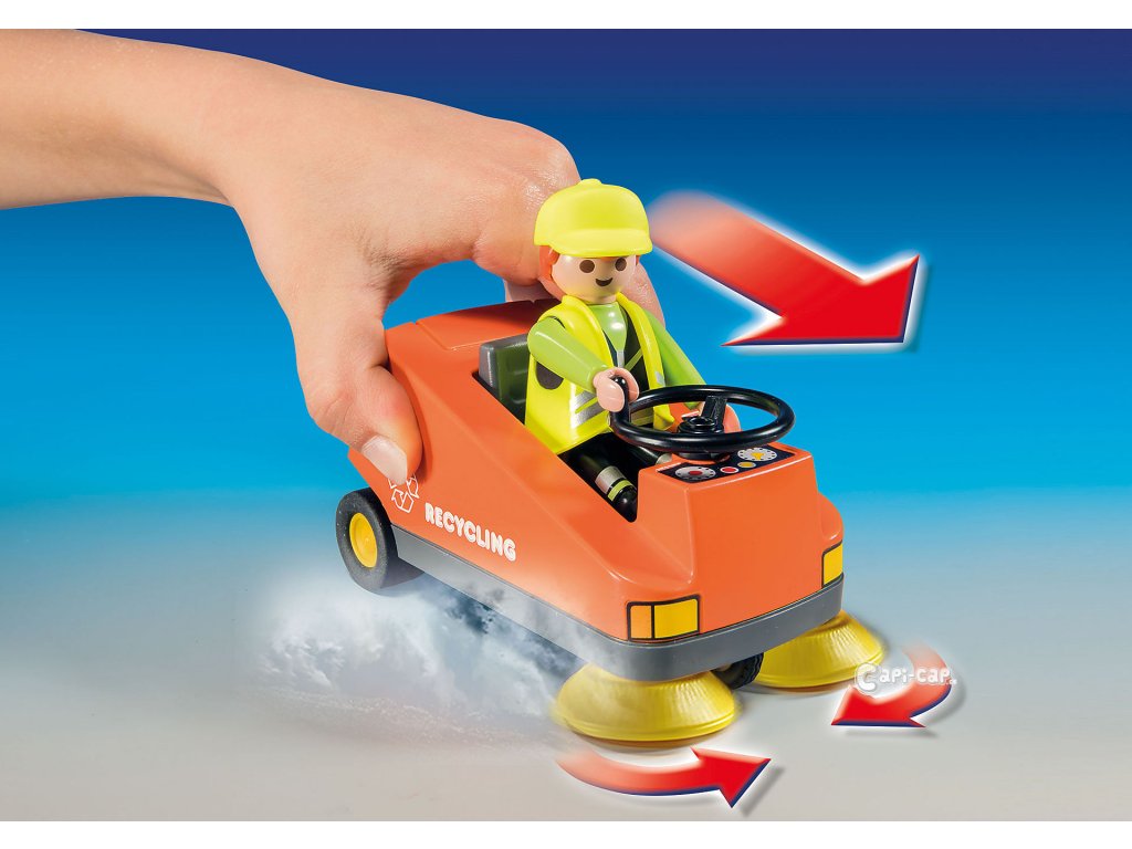 Pořádek musí být! Čištění rušných ulic PLAYMOBIL® pomocí zametače zajišťuje čistotu na silnici. Řidič pomalu jede po silnici v zametacím stroji, aby vše vyčistil. Dnes je práce jednodušší, protože krátce předtím tam byli kolegové z odvozu odpadu a odpad již odvezli. Vždy by to mohlo být tak snadné.