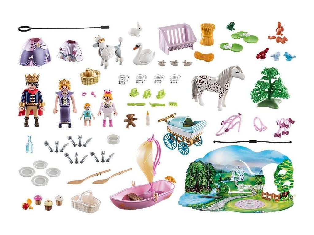 Dnes královská rodina pořádá v parku piknik. Nejprve člun vyjede na jezero a potom může malá princezna jezdit na poníkovi, zatímco král vezme dítě na procházku v kočárku. Královna a královský pudl je sledují a relaxují u občerstvení. S tímto pohádkovým adventním kalendářem letí čas do Vánoc.Populární adventní kalendáře PLAYMOBIL® po mnoho let zkracují čekání dětí na Štědrý den.
