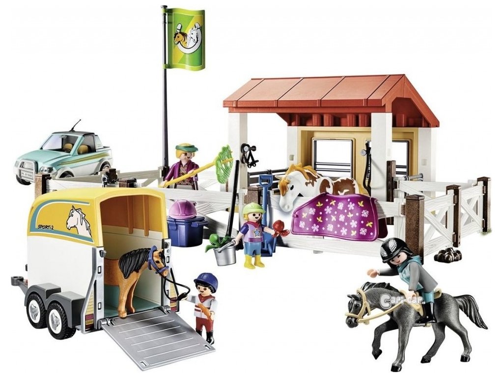 Sada obsahuje čtyři figurky PLAYMOBIL, tři koně, stáj, auto s přívěsem pro převoz koní, jezdecké helmy, deku pro koně, slámu a mnoho dalšího jezdeckého příslušenství.