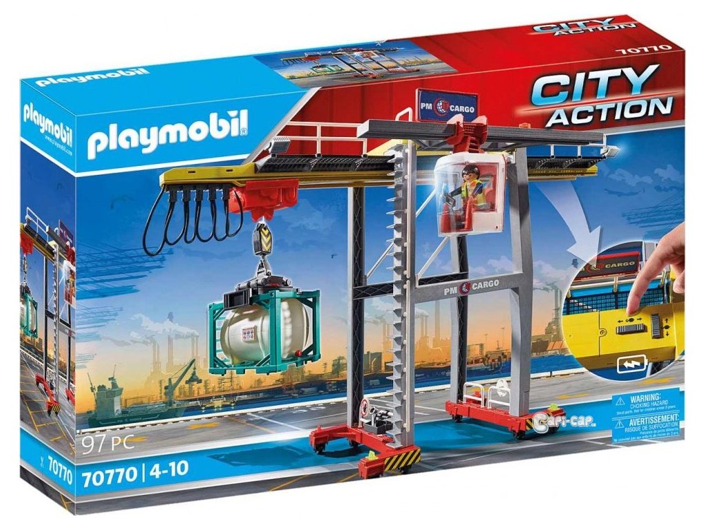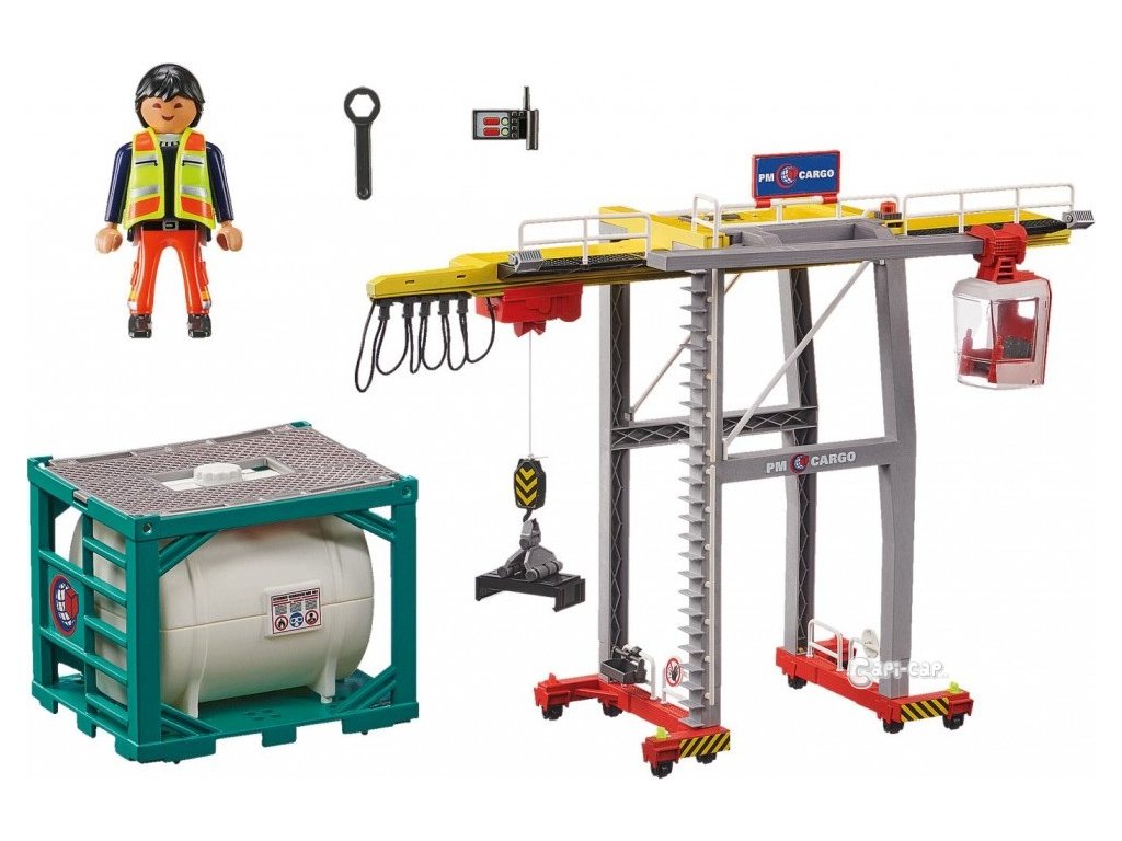 Herní sada obsahuje figurku PLAYMOBIL, elektrický portálový jeřáb, kontejner s ocelovým rámem se sudem, ochrannou vestu a mnoho dalších doplňků. Portálový jeřáb lze podélně přesouvat na kolečkách a nakládat tak několik kontejnerů za sebou.