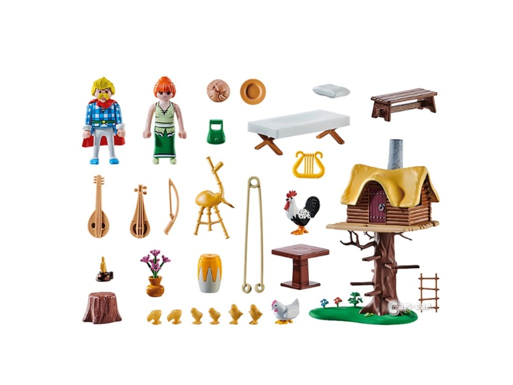 Sada obsahuje barda Trubadixe a paní Methusalix, dům na stromě s nábytkem a odnímatelnou střechou, dudy, housle, harfu, kytaru, bongo, kohouta, slepici, 6 kuřat a spoustu dalších doplňků. Figurku lze přivázat k větvi pomocí přiloženého lana. Střechu domku na stromě lze sundat a je vybavena mnoha doplňky. Rozměry domku na stromě se základovou deskou: 28 x 23 x 43 cm