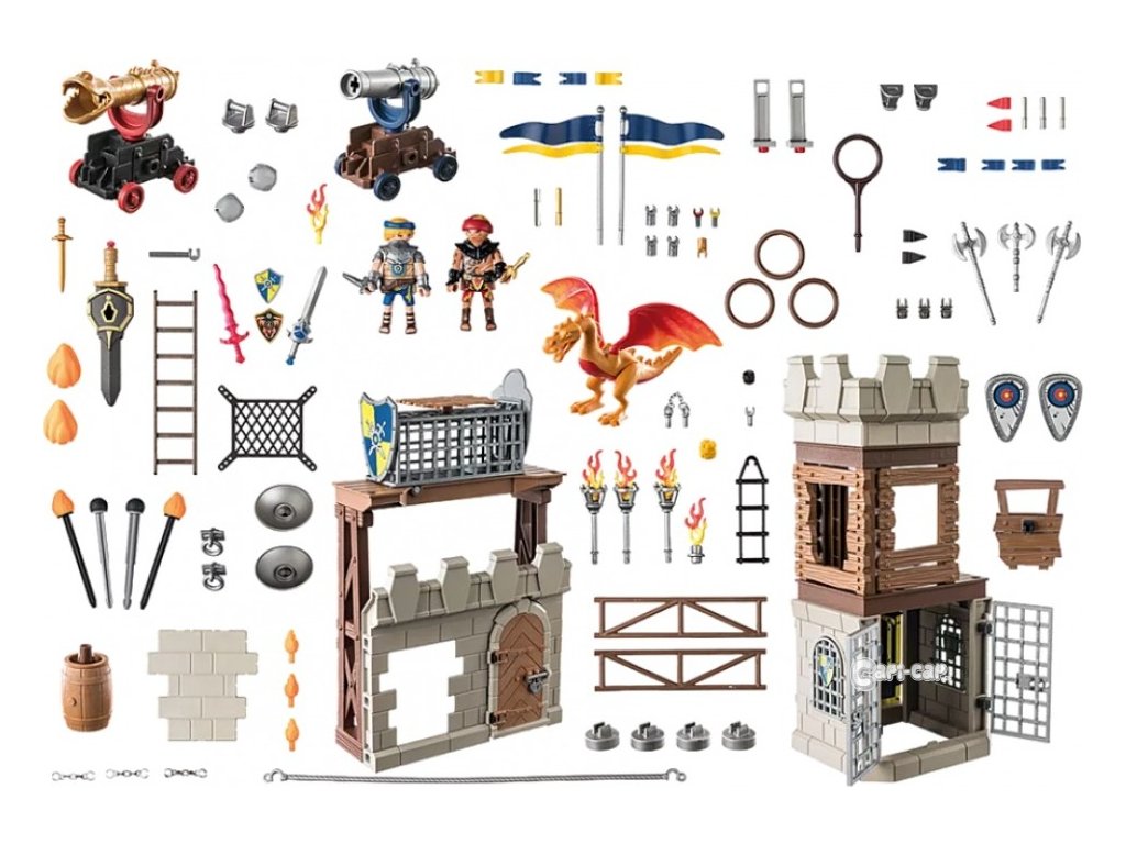 Dětská hrací sada s 219 díly, dvěma figurkami PLAYMOBIL, pohyblivým drakem, věží a nástěnným prvkem, funkčními děly a mnoha dalšími doplňky pro akční hry v dětském pokoji.