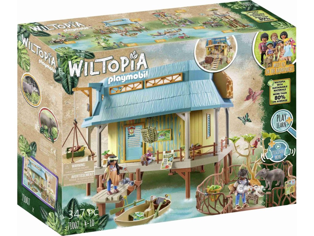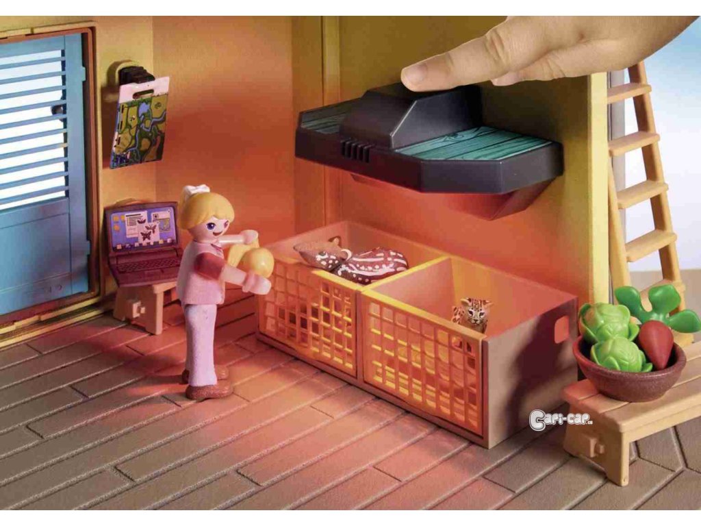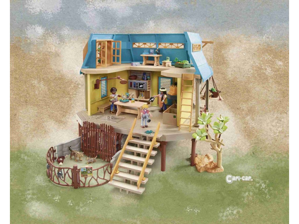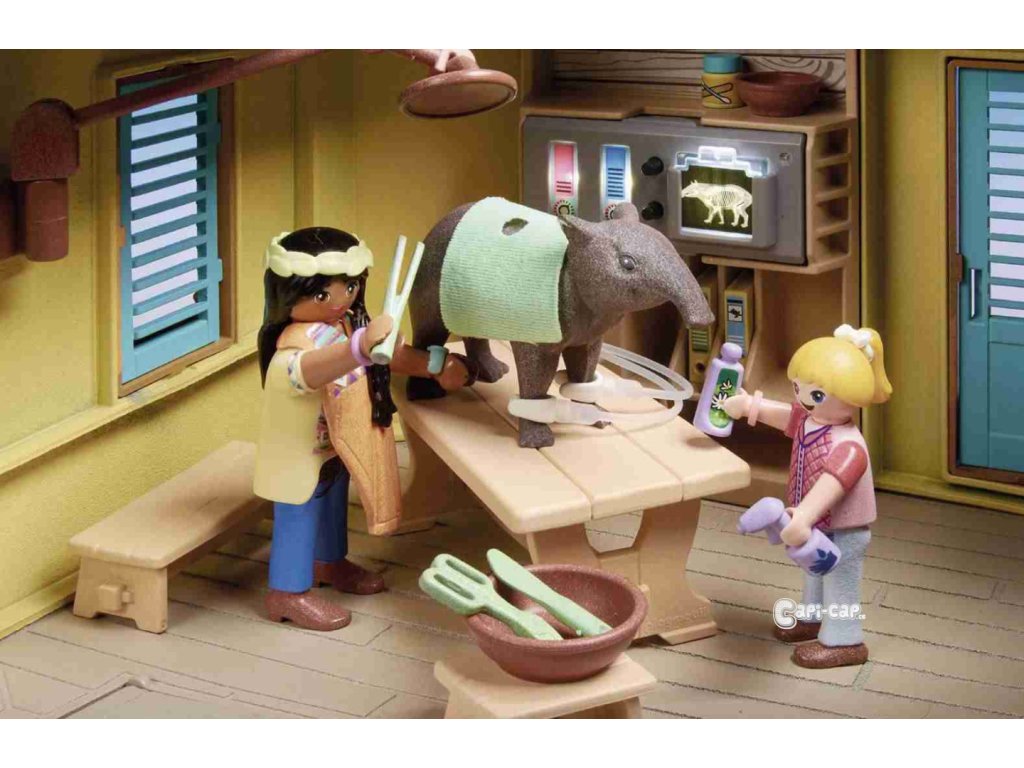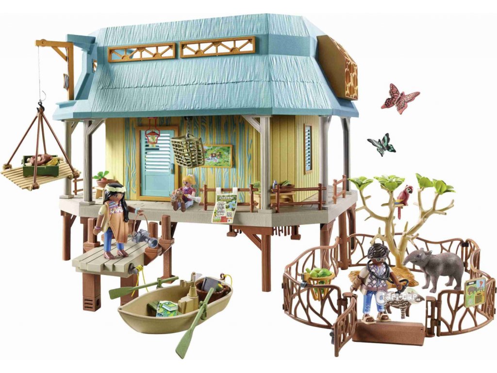 Dvoupatrová stanice péče o zvířata se nachází podél řeky. Zde se o původní zvířata pečuje a pečuje o ně. Ke stanici se dostanete po schodech nebo na břehu řeky přes molo. Stanice je dobře vybavena pro péči o zvířata a má ošetřovací místnost se stolem, pohyblivou chirurgickou lampou, váhou, tepelnou lampou a osvětleným monitorem pro prohlížení rentgenových snímků. Do nejvyššího patra stanice vede žebřík. Je tam skladováno jídlo a k dispozici je vybavení pro výzkum hmyzu. Po úspěšné léčbě mohou zvířata využít dva venkovní výběhy k relaxaci. V současnosti je tam umístěn tapír a rodinka ocelotů. Jakmile jsou zvířata opět zdravá, jsou vypuštěna do přírody. Tato detailní herní sada zavede děti do fascinujícího světa Amazonie. Hrací sada obsahuje tři figurky PLAYMOBIL, Sofii a Liv Palmerových a Ward Managera Dr. da Silva, plně vybavená zvířecí rezervace s molem a venkovními výběhy, pramice, tapírská rodinka, ocelotí rodinka, dva motýli, papoušek a mnoho dalších doplňků pro vzrušující dobrodružství v divočině. S novou velikostí figurky pro děti 5,75 cm.