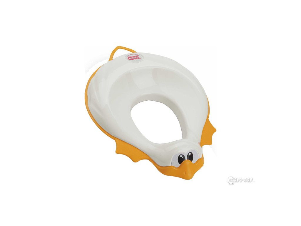 Redukce na WC Ducka s měkkým polstrováním sedadla zajišťuje pohodlné sezení pro Vaše dítě během důležité chvíle. Dá se bezpečně připevnit na záchodovou mísu. Je vybavena dvěma držadly po stranách, KDE se mozem dítě chytit. Polstrované sedadlo JE možné snadno Vybrat vyčistit. Na spodní straně se nacházejí protiskluzové Gumové krytky, které bráníme Redukce v pohybu. Rozměry produktu (v x š x d): 9,5 x 41 x 32,5 cm
