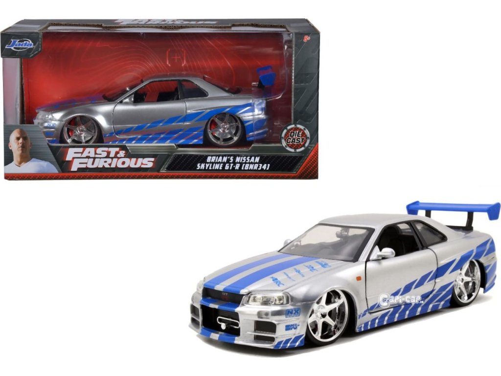 Kovový model auta z filmu Rychle a zběsile - GTR-R R34 na volnoběh v měřítku 1:24, otevírací dveře, kufr a kapota, délka 19 cm.