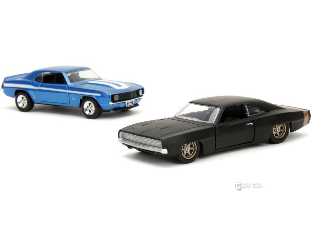 Kovové modely aut z filmu Rychle a zběsile ve dvojbalení - Chevrolet Camaro 1969 a Dodge Charger Wide Body 1968, volnoběh, otevírací dveře, měřítko 1:32, velikost 13 cm. Wave 2/1.