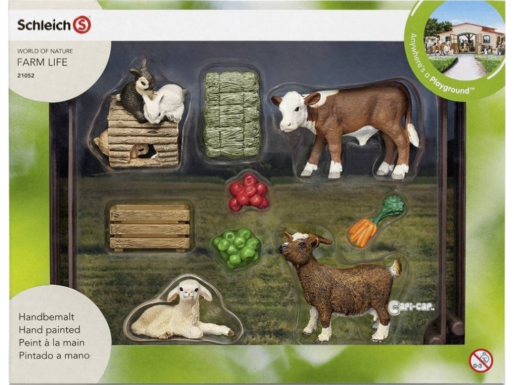 ZOO koutek pro děti obsahuje krásné, ručně malované figurky mláďat ze statku: 1 telátko, 1 jehně, 1 kůzle, 2 králíčky, seno, 1 bednu, 1 svazek mrkví, jablka červená a zelená a 6 dílů plotu, ze kterých se jednoduše spojením vytvoří ohrádka pro zvířátka.