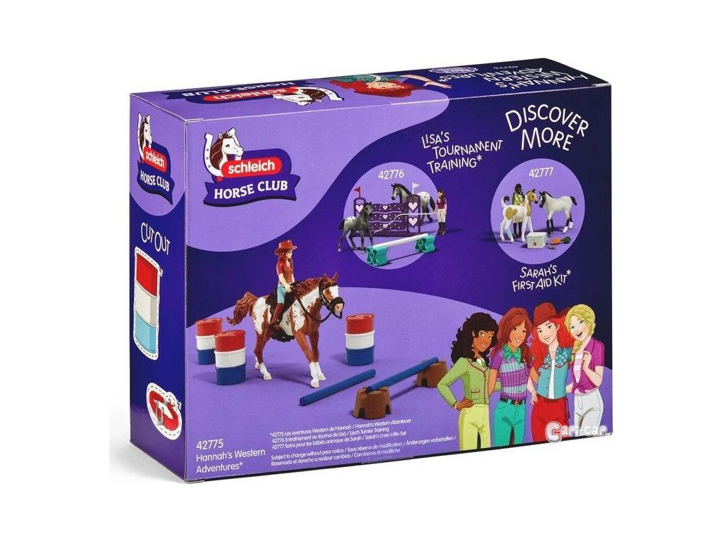 Konečně je to tady – Hannah westernové dobrodružství může začít. Hannah se rozhodla zúčastnit Barrel Racing se svým věrným valachem paint horse. Na tento turnaj usilovně trénovali. Na jezdeckém oválu jsou již postaveny tři sudy. Cíl: Se svým koněm chce tyto barely co nejrychleji objet v pevně daném pořadí. Před zahájením turnaje se Hannah se svým valachem paint horse chce trochu zahřát a nechá ho přeskočit několik překážek. Samozřejmě má na sobě kovbojský klobouk a sedí ve westernovém sedle. Ti dva vypadají skvěle, že? Obsah sady: 1x valach paint horse River, 1x figurka Hannah, 1x kovbojský klobouk, 1x červený náramek, 1x westernové sedlo, 1x uzda, 2x překážková tyč, 2x překážkový kmen stromu, 3x barelový díl modrý, 3x barelový díl červený, 3x barelový díl bílý. Sedlo a uzdu lze sejmout. Překážkové tyče lze použít k mnoha účelům. Sada Schleich® patří do tematického světa HORSE CLUB a je vhodná pro děti od 5 do 12 let. Rozměry balení: 19 x 24,5 x 8 cm. Nevhodné pro děti do 3 let. Věk: 5+