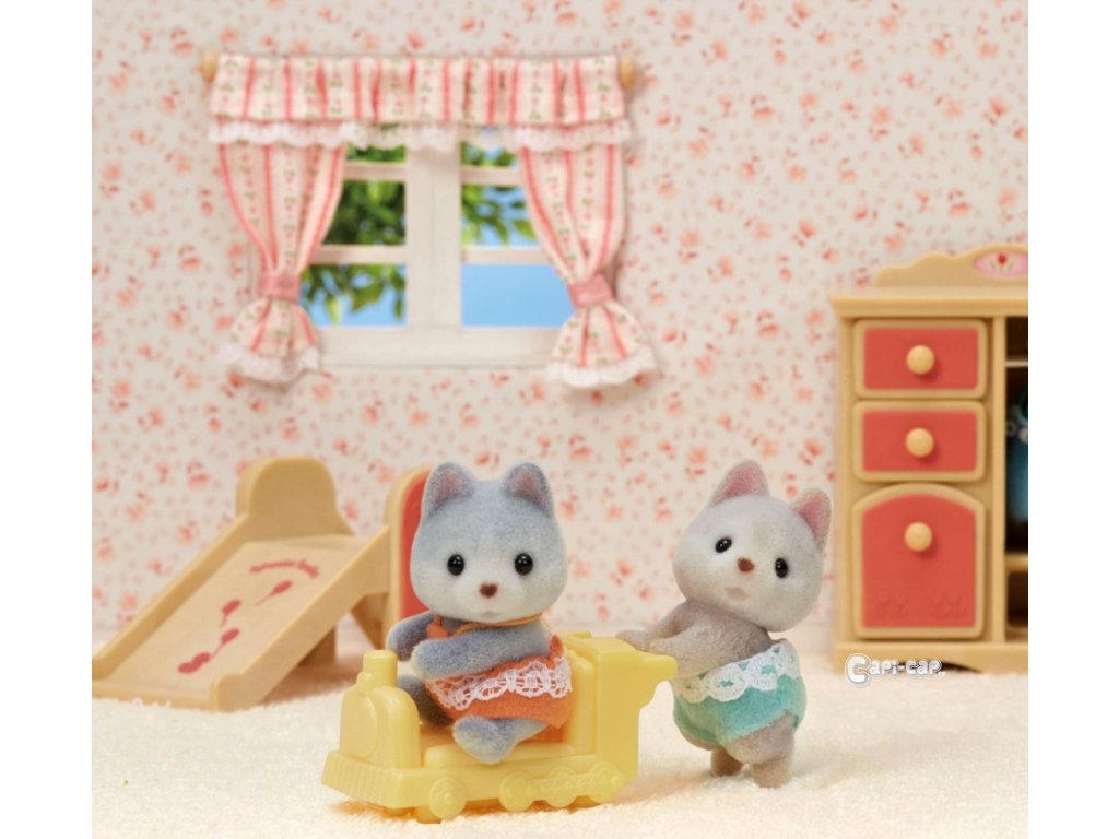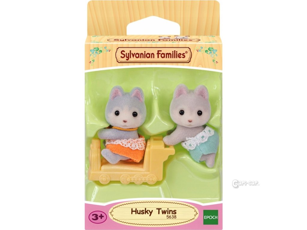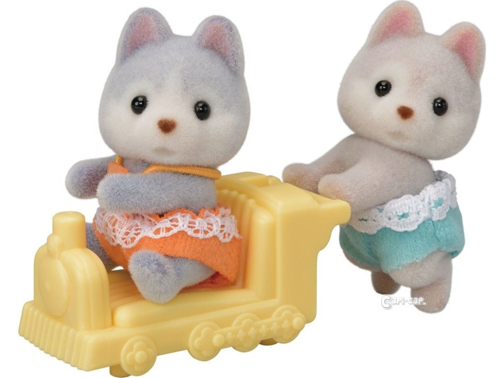 Sada Dvojčata Husky obsahuje figurky miminka Amber (sedící) a Jeremyho (plazí se) spolu s vozíkem (vláček). Amber má šedou srst a Jeremy hnědou. Na vozíku může jezdit kterékoli z dvojčat Husky (sedící nebo plazící). Postavičky mají otočné hlavy. Zkombinujte s Rodinou Husky a sadou Tandemové kolo pro Husky sourozence (obojí se prodávají samostatně) pro zábavu s celou Husky rodinou. Vozík můžete také připojit k saním sady Rodina Husky nebo ke kočárkům jiných dvojčat (vše se prodává samostatně). Nebo je zkombinujte s dalšími domy a nábytkem (prodávají se samostatně) pro ještě zábavnější a nápadité hraní! Věk: 3+