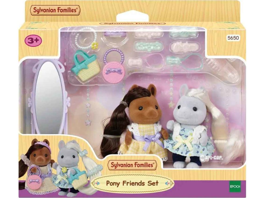 Sada Poníci kamarádi v kadeřnictví obsahuje dvě figurky pony s hedvábnými vlasy, stylové volně stojící zrcadlo, vlasové a módní doplňky. Upravte si vlasy dívek Pony a kombinujte různé tašky a doplňky, abyste vytvořili outfity od hlavy až k patě. Kaštanová pony dívka Vera má na sobě šaty, zatímco dívka Giselle nosí kalhoty a top. Zkombinujte se stylovým salonem Kadeřnický salón pro poníky (prodává se samostatně) pro ještě zábavnější a nápadité hraní. Tato sada obsahuje figurky a doplňky a lze s ní hrát samostatně. Stimuluje u dětí imaginativní hraní rolí. Věk: 3+