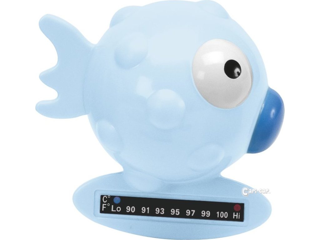 Koupelový teploměr ve tvaru rybičky se speciálním proužkem vyrobeným z materiálu, ketrý reaguje na teplo. Snadno napomáhá určit správnou teplotu koupele.