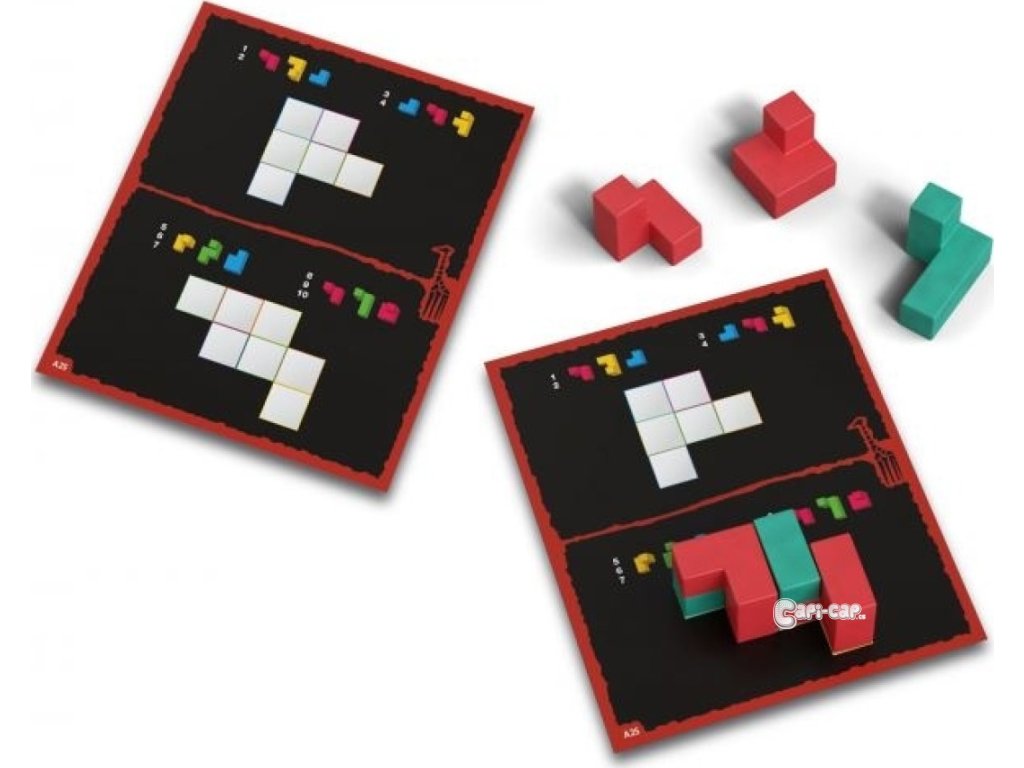 V rodinné hře Ubongo 3D máte za úkol zakrýt prázdná pole na kartě trojrozměrnými dílky do výšky dvou pater správně na sebe.
